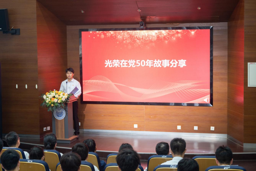退伍大学生代梓贤以演讲的形式与大家分享王国建教授光荣在党50年的故事。王国建教授从知青岁月的磨砺到大学之路的探索,再到教育之路的辛勤耕耘,始终秉持着对科研报国的坚守、对知识的追求和对真理的探索。为青年学子树立了优秀榜样。