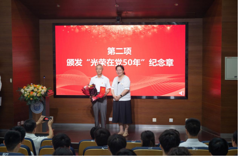 学院党委书记杨晓杰为学院“光荣在党50年”老党员同志代表王国建教授颁发“光荣在党50年”纪念章。