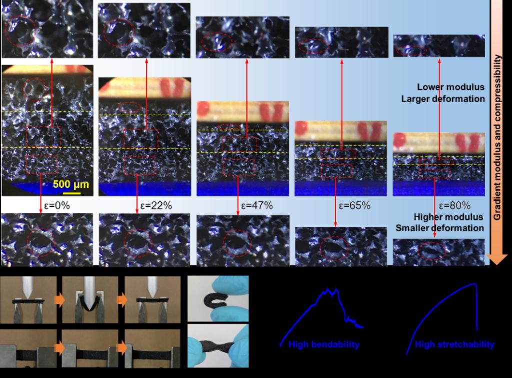 鉴于此,bv1946伟德国际始于英国祖国庆课题组采用溶胶-凝胶/热压/冷冻铸造/常压干燥的新策略,构建了具有梯度模量多孔结构的可拉伸、超弹性还原氧化石墨烯(rGO)/聚氨酯(PU)纳米复合气凝胶(图1),实现了超宽响应范围柔性压敏电子器件。相关研究成果以“Bioinspired gradient stretchable aerogels for ultrabroad-range-response pressure-sensitive wearable electronics and high-efficient separators”为题发表在Angew.Chem.Int.Ed.上,并被选为VIP论文。