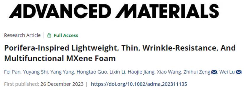 近日,《先进材料》(Advanced Materials)在线发表了bv1946伟德国际始于英国陆伟教授课题组的研究论文“Porifera-Inspired Lightweight, Thin, Wrinkle-Resistance, And Multifunctional MXene Foam”,课题组博士生潘飞为文章第一作者。