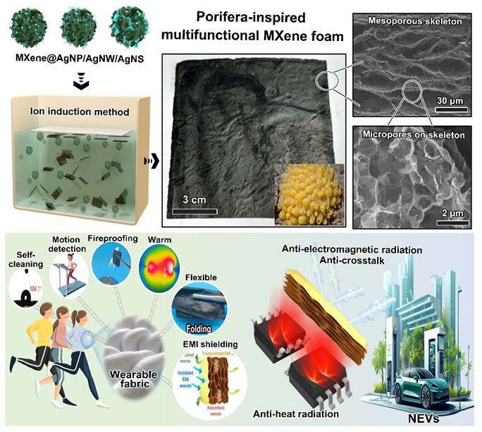 该研究从海洋中的多孔生物结构中获得灵感,制备得到柔性、抗褶皱、超薄、轻质、多功能的MXene基电磁屏蔽泡沫。该材料由连通的初级多孔骨架以及分布在多孔骨架上的次级多孔结构构成。得益于结构的设计和组分间出色的协同作用,该材料展现了109152.4 dB·cm2·g−1的超高屏蔽效能。