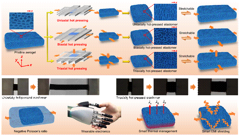 该研究发展了单轴、双轴和三轴热压策略,对气凝胶多孔结构进行调控,构建了折叠和内凹多孔结构,获得了高可拉伸导电多孔弹性体超材料。单轴热压得到的多孔弹性体具有折叠多孔结构、高达1200%的可拉伸性以及近零的泊松比。双轴和三轴热压得到的多孔弹性体具有独特的内凹多孔结构、高可拉伸性以及负的泊松比。该工作解决了传统多孔材料可拉伸性差的难题,实现了高可拉伸多孔超材料、宽范围应变传感器以及可调控的热管理和电磁屏蔽。