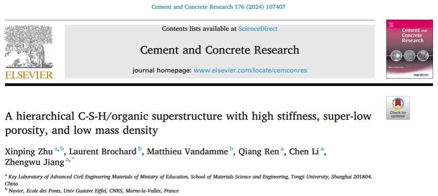 近日,《水泥混凝土研究》(Cement and Concrete Research)在线发表了伟德国际材料科学与工程学蒋正武教授课题组的研究论文“A hierarchical C-S-H/organic superstructure with high stiffness, super-low porosity, and low mass density”,本文通讯作者为蒋正武教授,第一作者为学院博士朱新平博士。