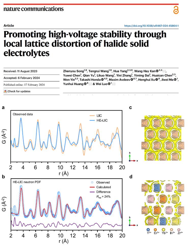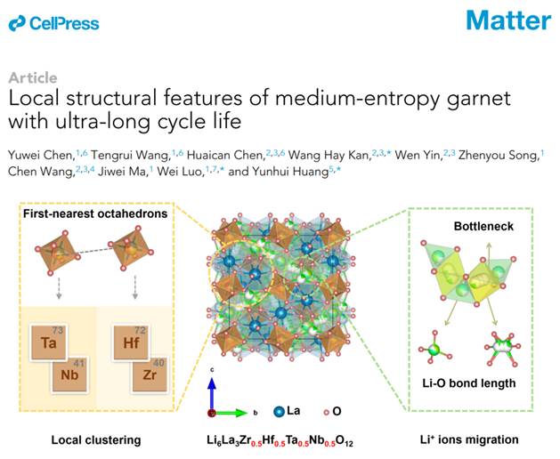 无机类固态电解质是实现高安全性和高比能固态电池的关键材料。无机材料中离子的迁移和耐氧化能力受到材料局部结构的影响,鉴于不同金属离子尺寸的差异,伟德国际材料学院车用新能源研究团队与中国科学院高能物理研究所简宏希等人合作通过在晶格中引入不同离子来对局部结构进行调整,有效提升了固态电解质材料的离子电导率及电化学稳定性。研究成果以“Promoting high-voltage stability through local lattice distortion of halide solid electrolytes”和“Local structural features of medium-entropy garnet with ultra-long cycle life”为题分别发表于《自然·通讯》 (Nature Communications)和《物质》(Matter),bv1946伟德国际始于英国博士生宋振友和陈雨薇为这两篇论文的第一作者。