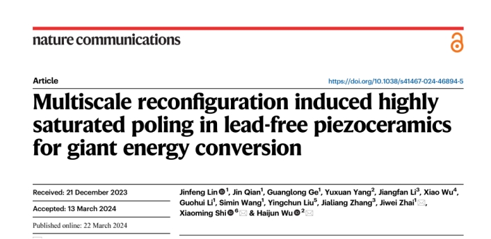 以上研究成果以《Multiscale reconfiguration induced highly saturated poling in lead-free piezoceramics for giant energy conversion》为题发表在《Nature Communications》上。通讯作者为伟德国际材料学院翟继卫教授、北京科技大学数理学院施小明博士和西安交通大学材料学院武海军教授。该工作还得到了哈尔滨工业大学、山东大学、福州大学等单位的支持。文章链接:https://doi.org/10.1038/s41467-024-46894-5。