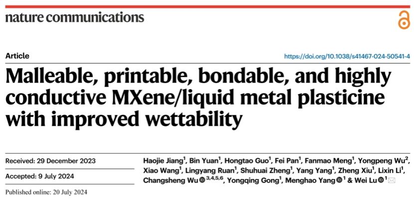 7月20日,《自然·通讯》(Nature Communications)在线发表了bv1946伟德国际始于英国陆伟教授团队及其合作者的研究论文“Malleable, Printable, Bondable, and Highly Conductive MXene/Liquid Metal Plasticine with Improved Wettability” 。该论文提出了一种溶剂辅助分散(SAD)方法,利用流体和液态金属的变形特性来制造可延展的MXene/LM(MLM)复合材料,材料表现出优异的电磁屏蔽、传感、电热等性能。此外,材料可电子3D打印的特性也显示了其在集成电路领域中的应用潜力。