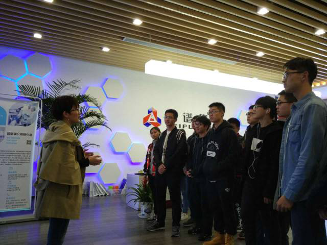 轻松的合照后全体学生被分为两组,交替参观了微谱公司的办公区、实验室以及蒲公英创业孵化基地,并了解了公司发展历程和目前取得的一些成绩。精心设计的烧杯形状的拱门,每间房间与元素周期表对应的门号,各种尖端仪器让同学们目不暇接,赞不绝口。