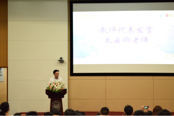 2019级高分子材料硕士班班主任朱云卿老师作为学院教师代表发言,他希望同学们在未来的科研生活中时刻保持进取的心态,并且注重于自己逆商的提高,即在逆境中抵抗压力的能力。同时他也为同学们的研究生生活提出了三点建议:第一,学会放弃,适时的放弃从来不是软弱,而是选择更加正确的道路再出发;第二,接受失败,因为即便是再伟大的科学家,也有过失败的科研经历;第三,成长心态从经验中学习,经常整理总结,这样终将成就一个更为强大的自己。