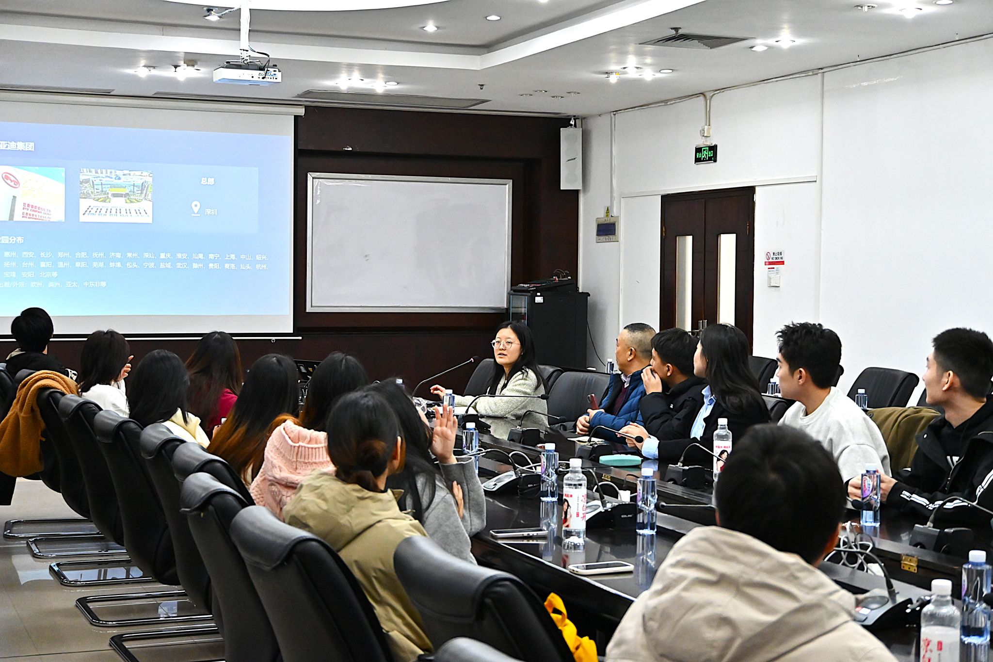 活动伊始,比亚迪人力资源科科长曹明吉先生和宋宇萌女士热情接待了来访的师生。宋女士全面介绍了比亚迪成立三十年以来的发展历程,从最初的电池制造业务至如今涵盖新能源汽车、电子、轨道交通等多个领域的全球领先企业,公司的每一步成长都凝聚着科技创新与人才战略的智慧结晶。围绕比亚迪当前的招聘政策、职业发展路径及员工福利等同学们关心的招聘相关事宜,曹先生和宋女士展开了详尽说明,为即将步入社会的同学们提供了宝贵的职业导航信息。