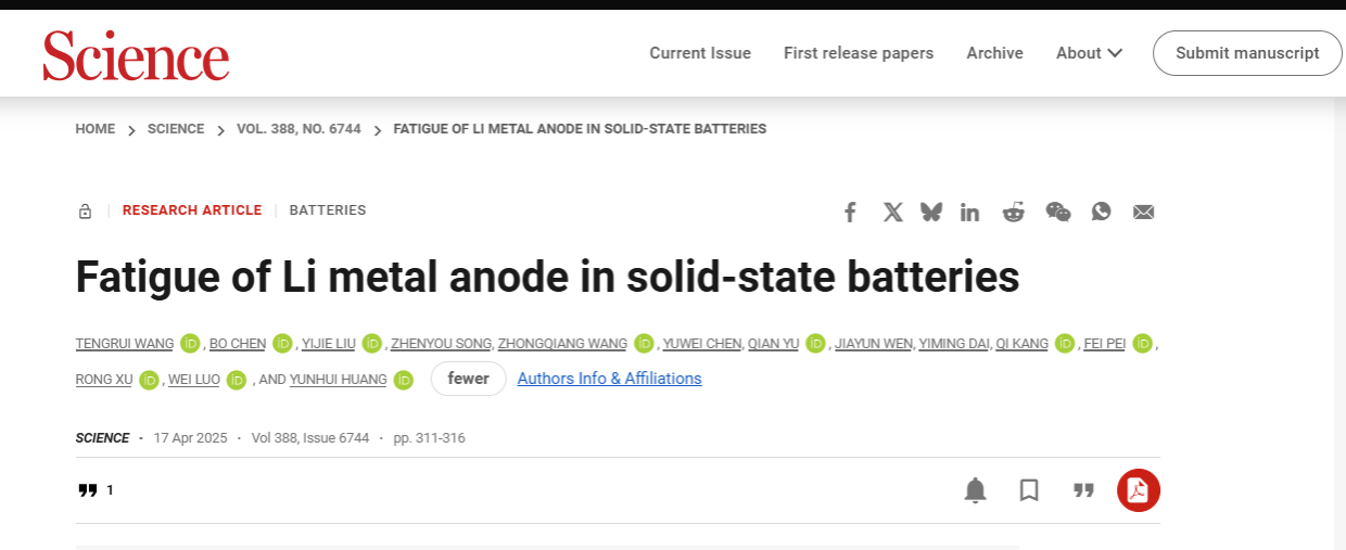 固态锂电池为何失效?bv1946伟德国际始于英国研究团队给出了新机制。北京时间4月18日凌晨,《科学》(Science)在线发表了我院罗巍教授与合作者题为“Fatigue of Li metal anode in solid-state batteries”(固态电池锂金属负极的疲劳)的研究论文。该研究首次发现了固态锂电池金属锂负极疲劳失效现象,揭示了疲劳失效新机制,并提出了抑制疲劳失效改善固态电池性能的新策略。
