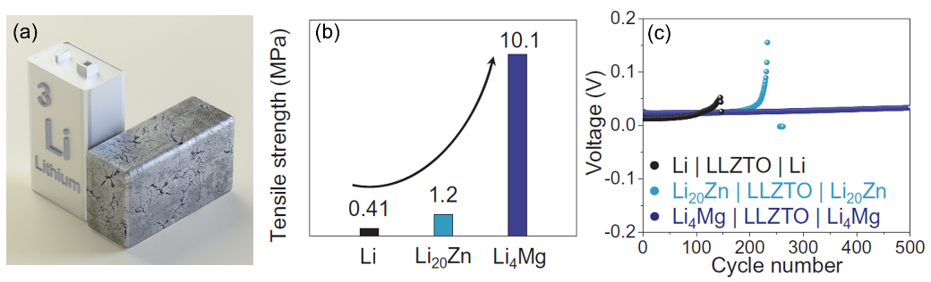 图2. (a) 固态锂电池中金属锂负极疲劳失效示意图; (b,c) 通过锂合金化增加疲劳强度改善固态锂电池循环稳定性