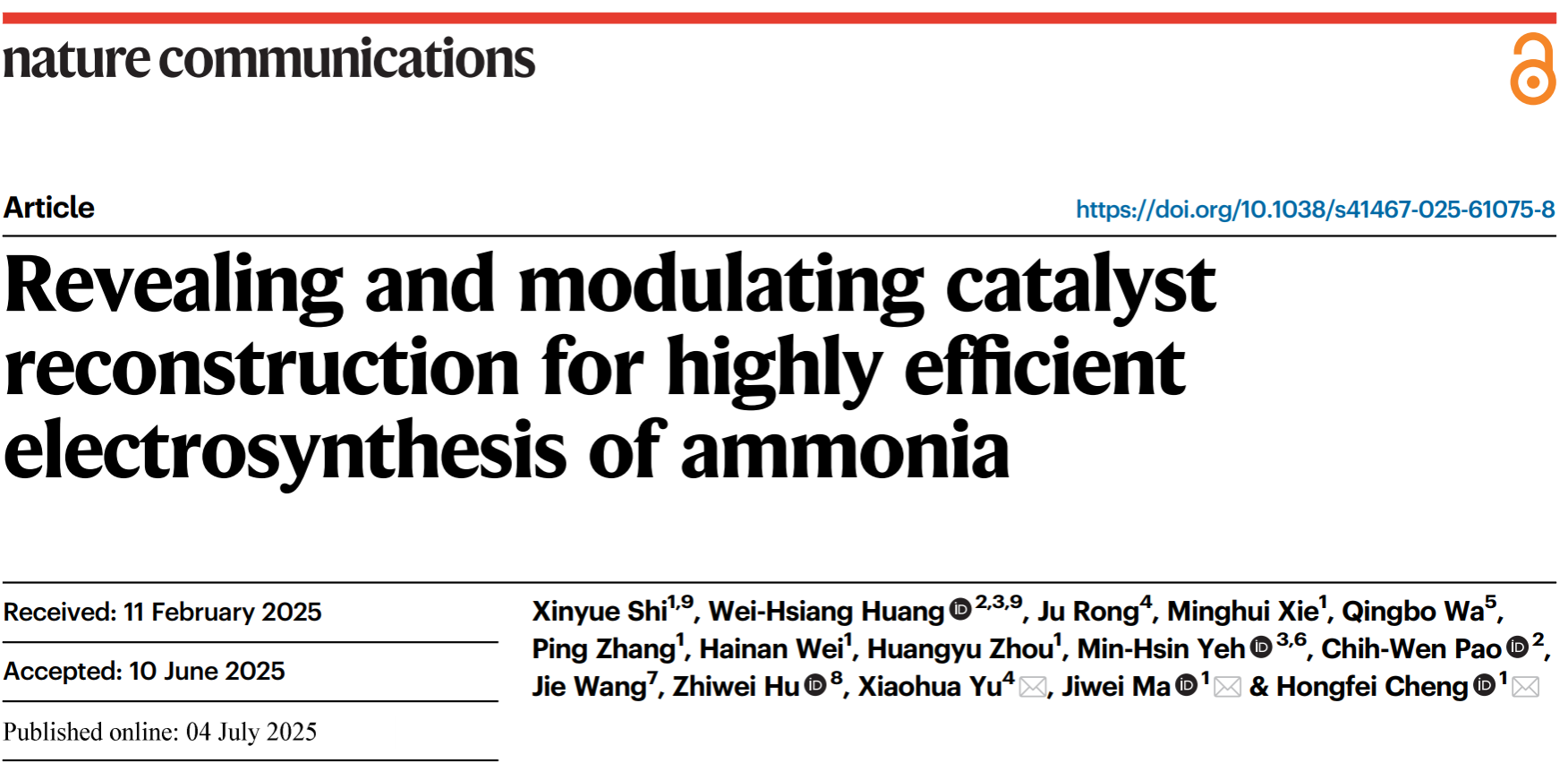 7月5日,bv1946伟德国际始于英国程洪飞特聘研究员团队有关开发电催化制氨催化剂的研究成果以“Revealing and modulating catalyst reconstruction for highly efficient electrosynthesis of ammonia”为题发表于《自然·通讯》期刊(Nature Communications)。