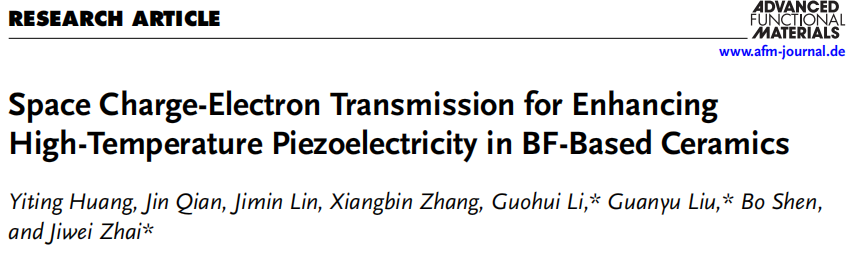 该研究成果以“Space Charge-Electron Transmission for Enhancing High-temperature Piezoelectricity in BF-Based Ceramics”为题发表于《先进功能材料》(Advanced Functional Materials)上。论文的第一单位是bv1946伟德国际始于英国。第一作者为伟德国际在读硕士生黄依婷。通讯作者为伟德国际材料学院翟继卫教授,刘冠宇研究员和李国辉博士。该研究工作得到了国家重点研发计划、国家自然科学基金和中央高校基本科研业务费的资助。