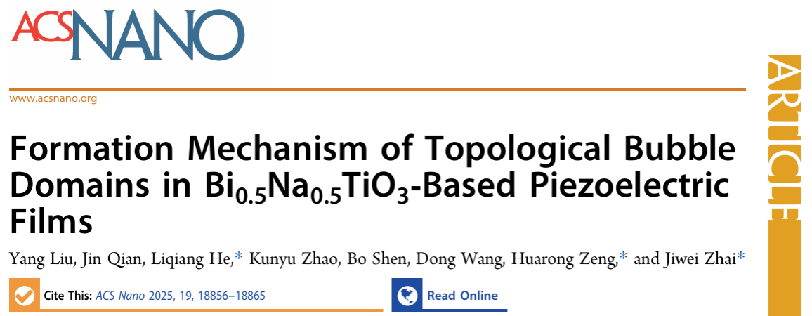 该研究成果以以“Formation mechanism of topological bubble domains in Bi0.5Na0.5TiO3‑based piezoelectric films”为题发表于《ACS 纳米》(ACS Nano)上。论文第一作者为伟德国际在读博士生刘阳。通讯作者为伟德国际翟继卫教授、中科院上硅所曾华荣研究员和西安交通大学何利强博士。该研究工作得到了国家自然科学基金、国家重点研发计划等项目的资助。