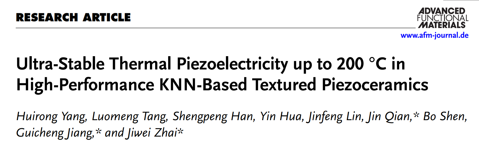 该研究成果以“Ultra-stable thermal piezoelectricity up to 200oc in high-performance KNN-based textured piezoceramics”为题发表于《先进功能材料》(Advanced Functional Materials)上。论文的第一单位是bv1946伟德国际始于英国。第一作者为伟德国际在读硕士生杨慧蓉。通讯作者为伟德国际翟继卫教授、哈尔滨工业大学姜桂铖教授和伟德国际钱进博士。该研究工作得到了国家自然科学基金的资助。