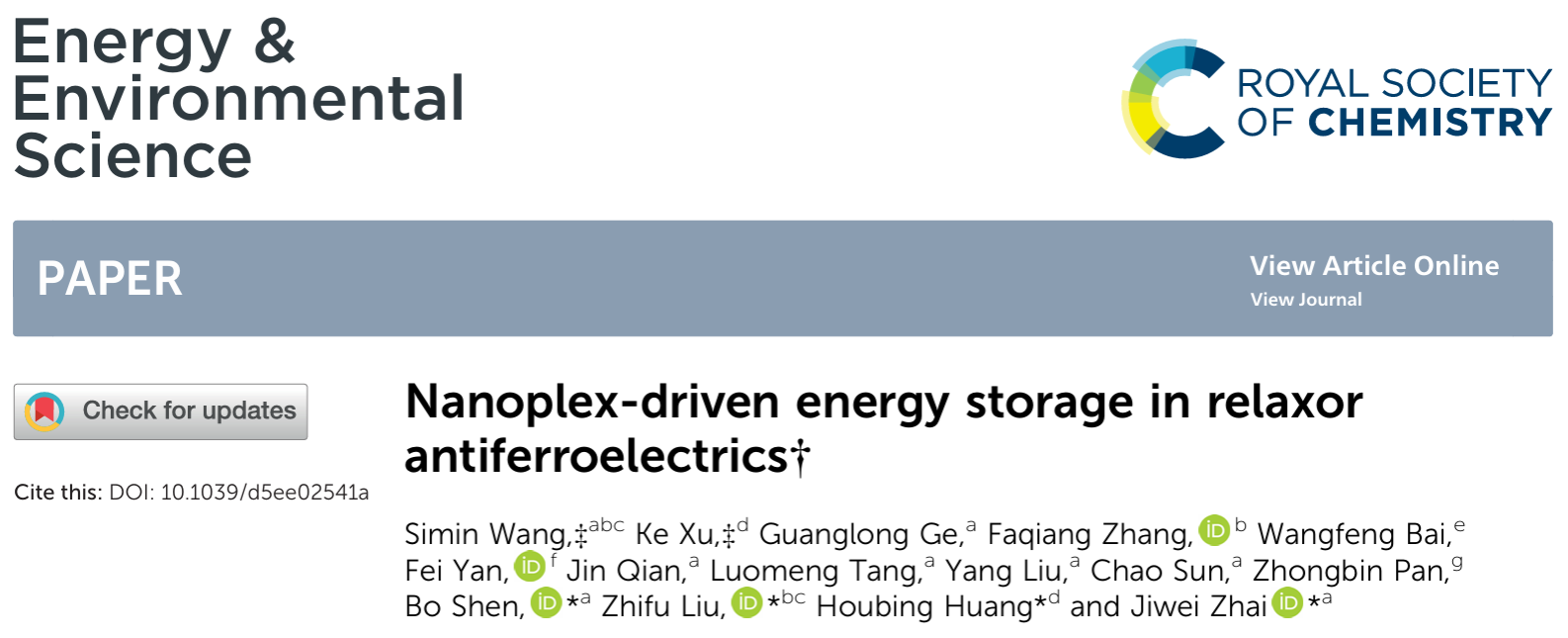 该研究成果以“Nanoplex-driven energy storage in relaxor antiferroelectrics”为题发表于《能源与环境科学》(Energy & Environmental Science)》上。论文的第一单位是bv1946伟德国际始于英国。伟德国际在读博士生王思民、北京理工大学在读博士生许可为共同一作。通讯作者为伟德国际翟继卫教授、北京理工大学黄厚兵教授、中科院上硅所刘志甫研究员和伟德国际沈波副教授。该研究工作得到了国家自然科学基金、国家重点研发计划等项目的资助。