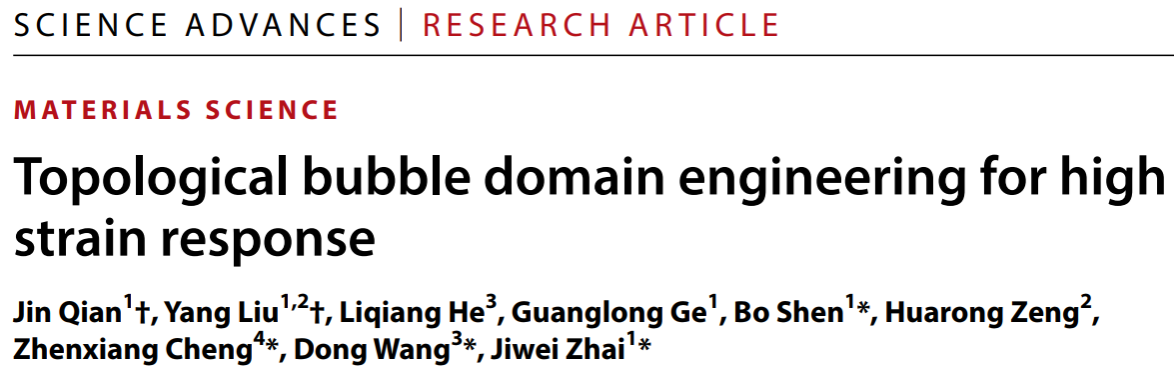 该研究成果以“Topological bubble domain engineering for high strain response”为题发表于《科学进展》(Science Advances)上。论文的第一单位是bv1946伟德国际始于英国。伟德国际钱进博士、伟德国际在读博士生刘阳为共同一作。通讯作者为伟德国际翟继卫教授、西安交通大学王栋教授、伍伦贡大学程振祥教授和伟德国际沈波副教授。该研究工作得到了国家自然科学基金的资助。