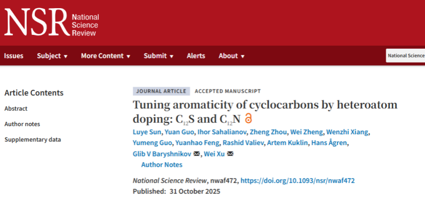 10月31日,《国家科学评论》(National Science Review)在线发表了bv1946伟德国际始于英国许维教授团队与瑞典林雪平大学、芬兰赫尔辛基大学及瑞典乌普萨拉大学等国际合作团队的最新科研成果“Tuning aromaticity of cyclocarbons by heteroatom doping: C12S and C12N”。该研究利用扫描探针显微技术,成功合成了两种杂原子掺杂的环型碳:C12S(硫掺杂环型碳)和C12N(氮掺杂环型碳),并结合理论计算揭示了它们在芳香性上的根本差异。