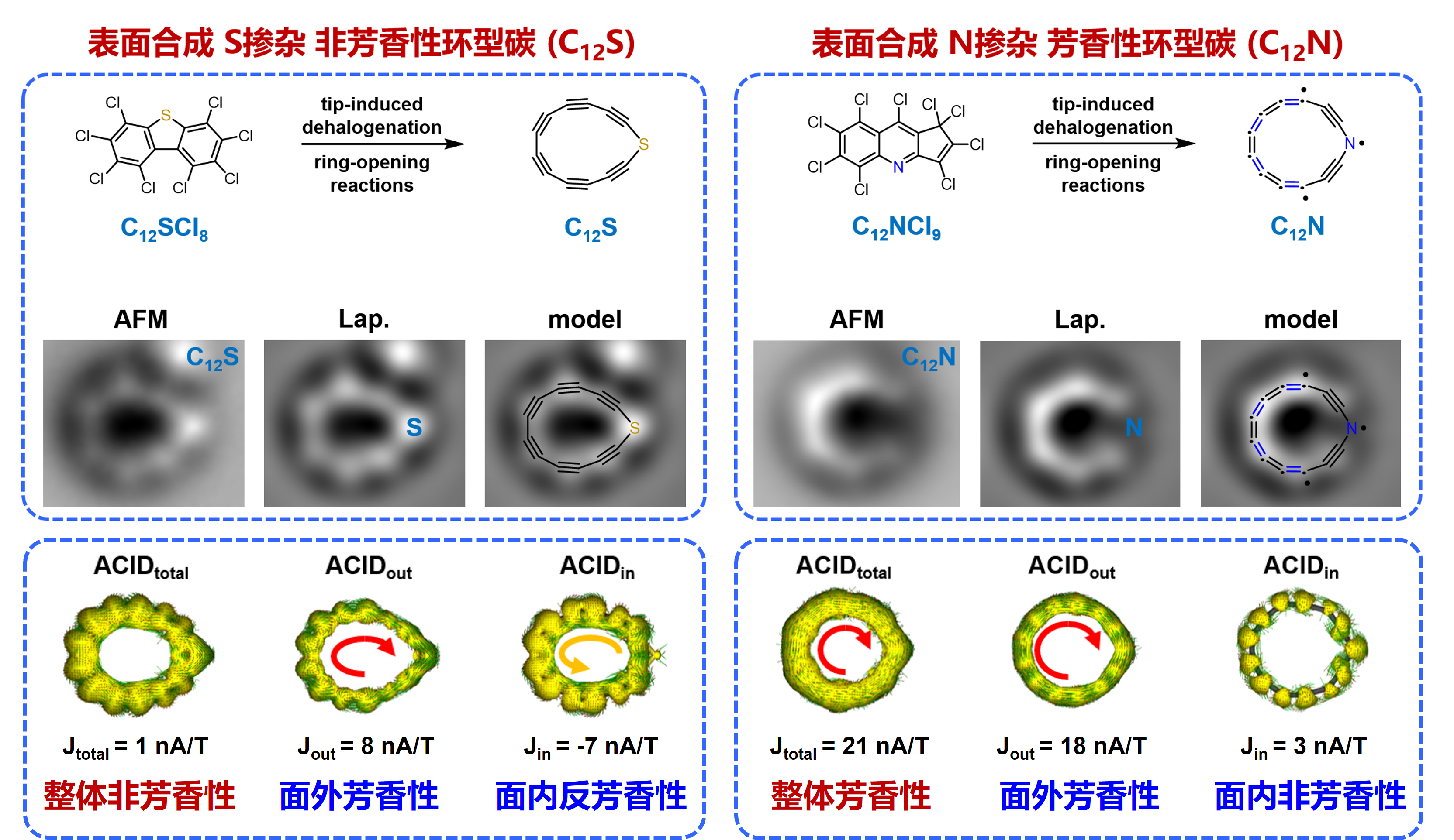 理论计算表明,C12S的面外π体系具有14个电子,呈现芳香性;而面内π体系具有12个电子,呈现反芳香性;尤为奇特的是二者强度相同,因为C12S整体表现为非芳香性。对于C12N,它的面外π体系具有14个电子,呈现芳香性;而面内π体系具有13个电子,呈非芳香性;因此C12N整体呈现芳香性。