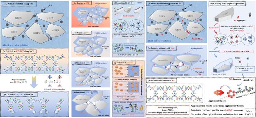 碱活化矿渣浆(AASP)因其较低的冰点,展现出在寒冷地区原位负温制备的潜力,而纳米材料的引入可促进其在低温下形成致密结构,是提升负温力学性能的关键途径。团队聚焦AASP在20℃至-20℃范围内的原位制备行为与多尺度表征手段,深入揭示了纳米氧化铝(NA)在负温下的改性机制。研究成果以“Unraveling the multiscale enhancement mechanism of nano-Al2O3 on subzero-prepared alkali-activated slag paste”为题发表在《水泥混凝土复合材料》(Cement & Concrete Composites)。第一作者为博士研究生许劲,通讯作者为蒋正武教授。