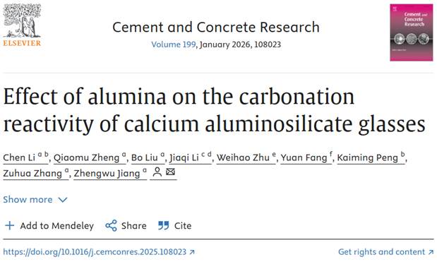 硅酸盐固废能吸收空气中的二氧化碳,将其转化为稳定的碳酸盐,是二氧化碳矿化封存的重要途径。团队聚焦固废中的玻璃相,研究其中的铝质组分对碳化反应的影响,从分子、纳米与微观等尺度揭示了铝对玻璃结构与碳化反应的影响机制。研究成果以“Effect of alumina on the carbonation reactivity of calcium aluminosilicate glasses”为题发表在《水泥混凝土研究》(Cement and Concrete Research)。第一作者为李晨助理教授,通讯作者为蒋正武教授。