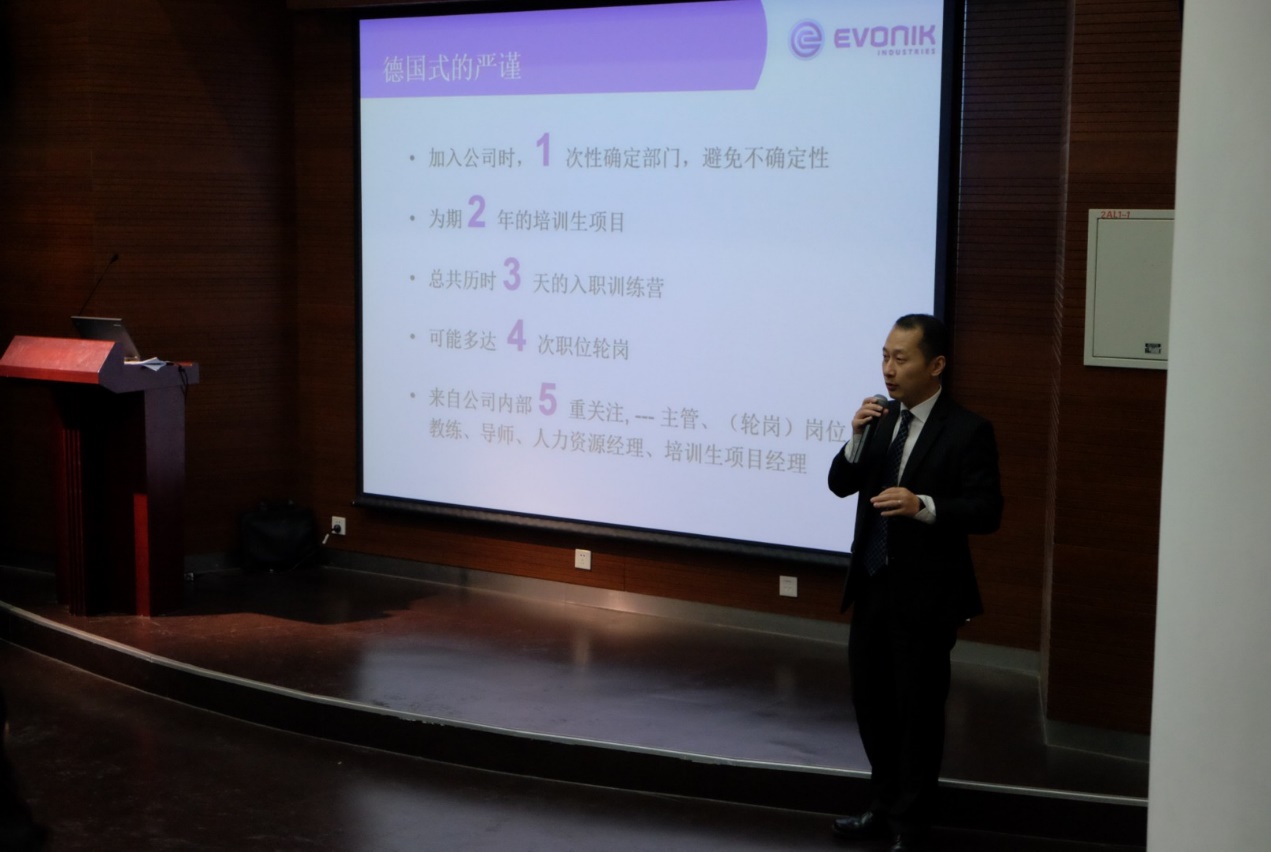 赢创大中华区总裁柯乐施博士首先介绍了赢创工业集团的概况、文化理念以及战略目标等情况,陈金秋博士分享了个人在赢创集团20年的发展成长经历,提到赢创的发展理念与伟德国际的追求“严谨、求实、团结、创新“的校训以及“同舟共济”的合作精神不谋而合,陈金秋博士也是我校留德预备部1987届留德学生。程大年介绍了赢创2017年岗位需求和赢创管培生项目,陆芳作为同济校友分享了她在赢创成长的十年经历,深刻体会到赢创以人为本的人才培养模式。