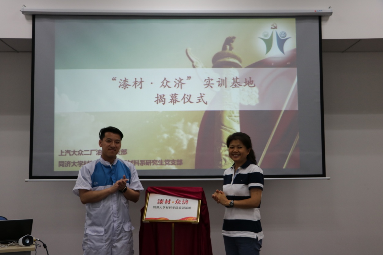 本次活动在上汽大众安亭汽车二厂培训室举行,共分为三个部分。首先是校企合作创立“漆材·众济”实训基地的揭牌仪式。伟德国际材料学院党委副书记王凌凌老师、上汽大众安亭汽车二厂党支书记刘涛共同为“漆材·众济”实训基地揭幕,并分别发言表达对“校企合作”的支持与期望。伟德国际材料学院党委副书记王凌凌老师表示校企合作是双方党支部进行党建的新形式、新途径,双方支部在前期合作基础上,应更多开展专业合作、互访交流等活动,同时迫切希望企业对学生党员的综合素质发展提供帮助,如企业为学生提供实习机会、讲述面试技巧等等。而上汽大众安亭汽车二厂刘涛书记表示校企合作是双方“走出去、请进来”方式的具体体现,双方支部在专业方面的合作仍需要进一步增强,企业会尽最大努力做好“校企党建”工作。