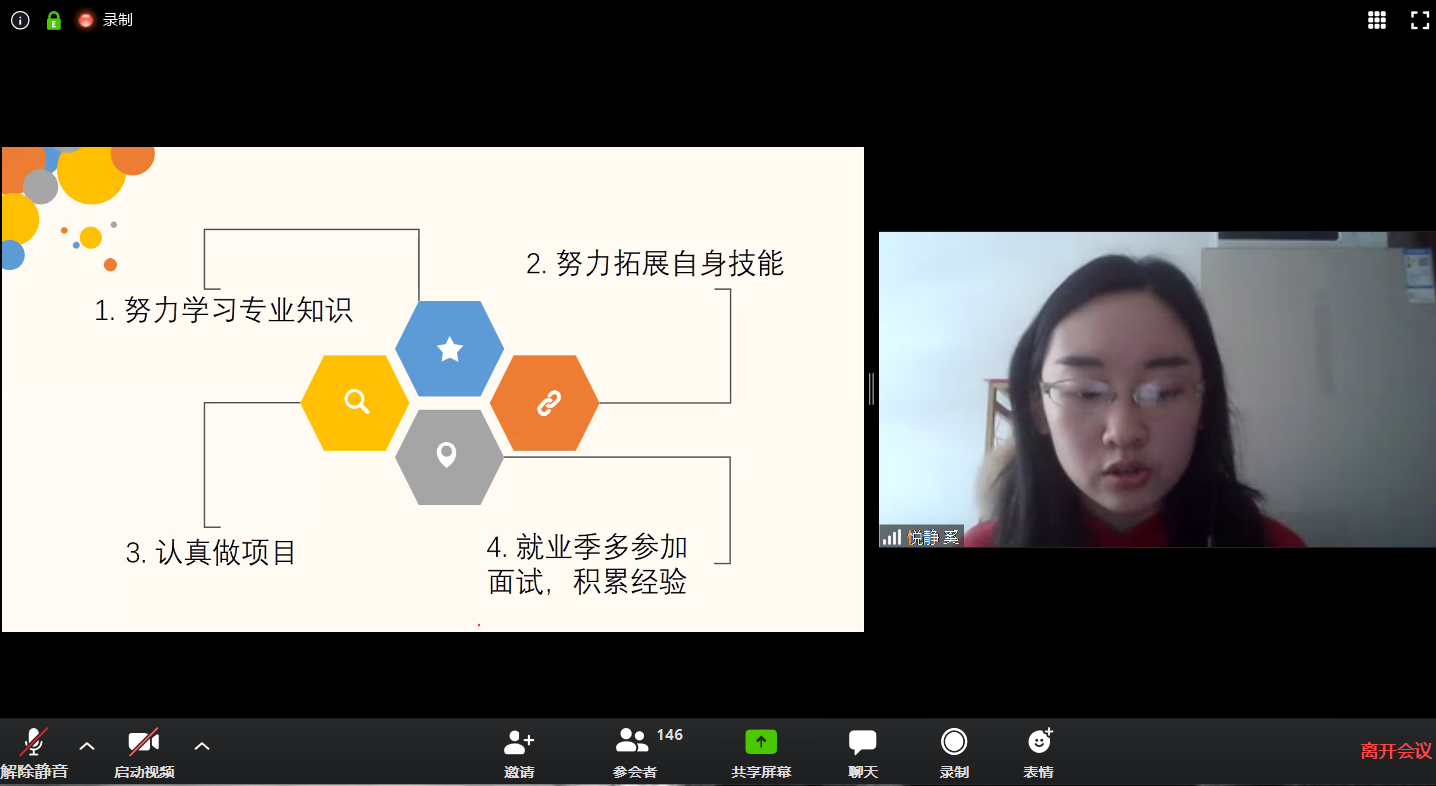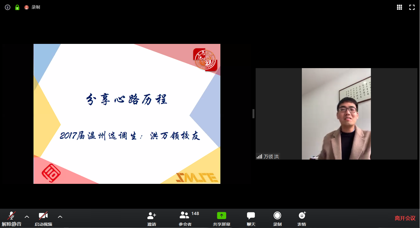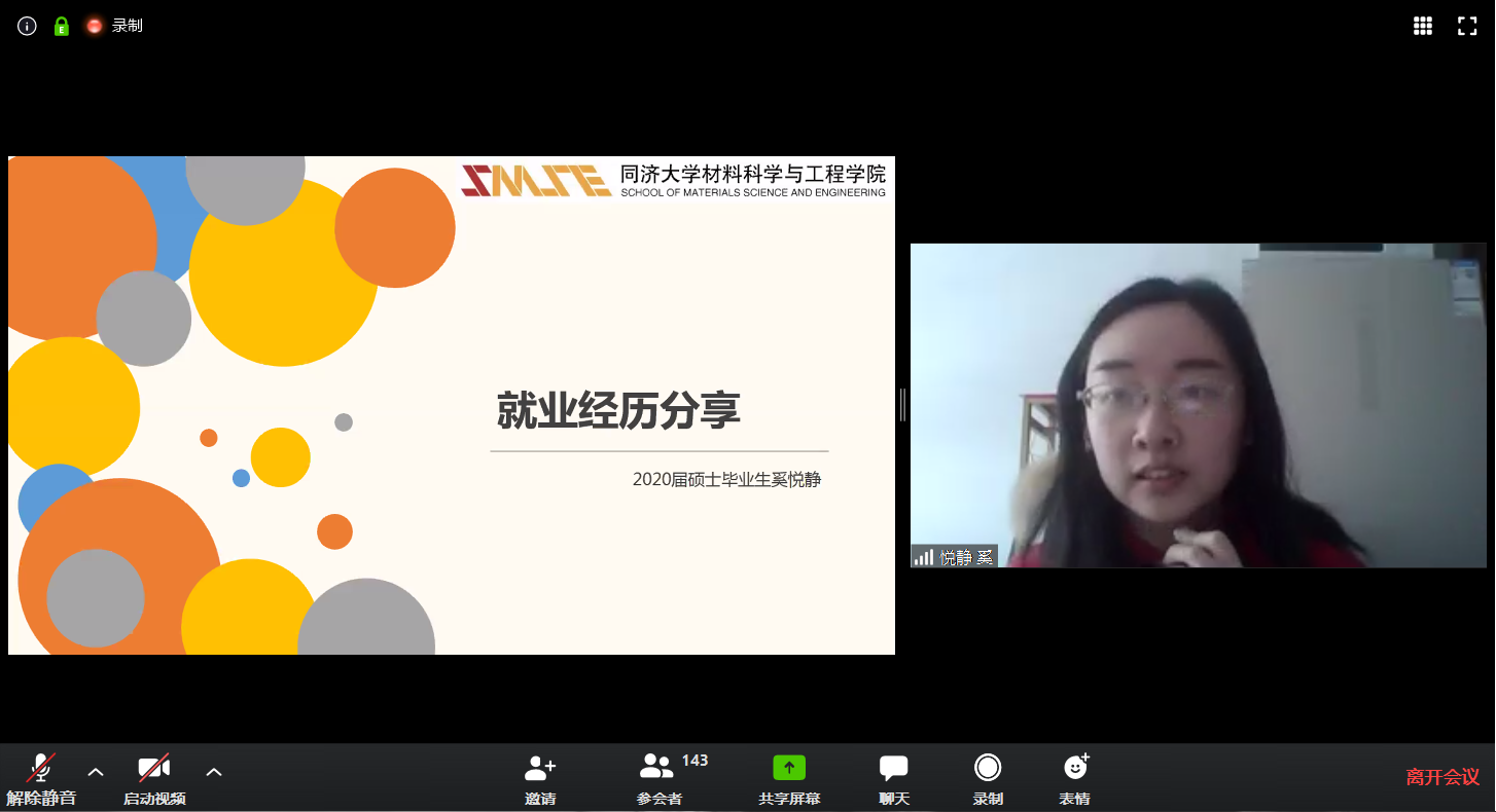 为积极应对疫情形势下毕业生就业工作面临的全新挑战,bv1946伟德国际始于英国2020年4月3日(周五)11:45于线上Zoom平台会议室召开了“材聚一堂,济梦未来——2020届毕业生就业指导交流会”。本次会议由bv1946伟德国际始于英国党委副书记王凌凌老师、学工办周龙老师和李楠老师共同参与,并邀请到2017届温州选调生洪万领校友、2020届毕业研究生奚悦静同学作为特邀毕业生代表做了交流发言。本次会议旨在响应疫情期间国家就业政策、学校和学院相关就业服务工作的号召,了解并解决应届毕业生的求职疑惑等问题,分享交流同学成功就业求职经验和建议,学院本研应届毕业生150余人参加了线上交流会。