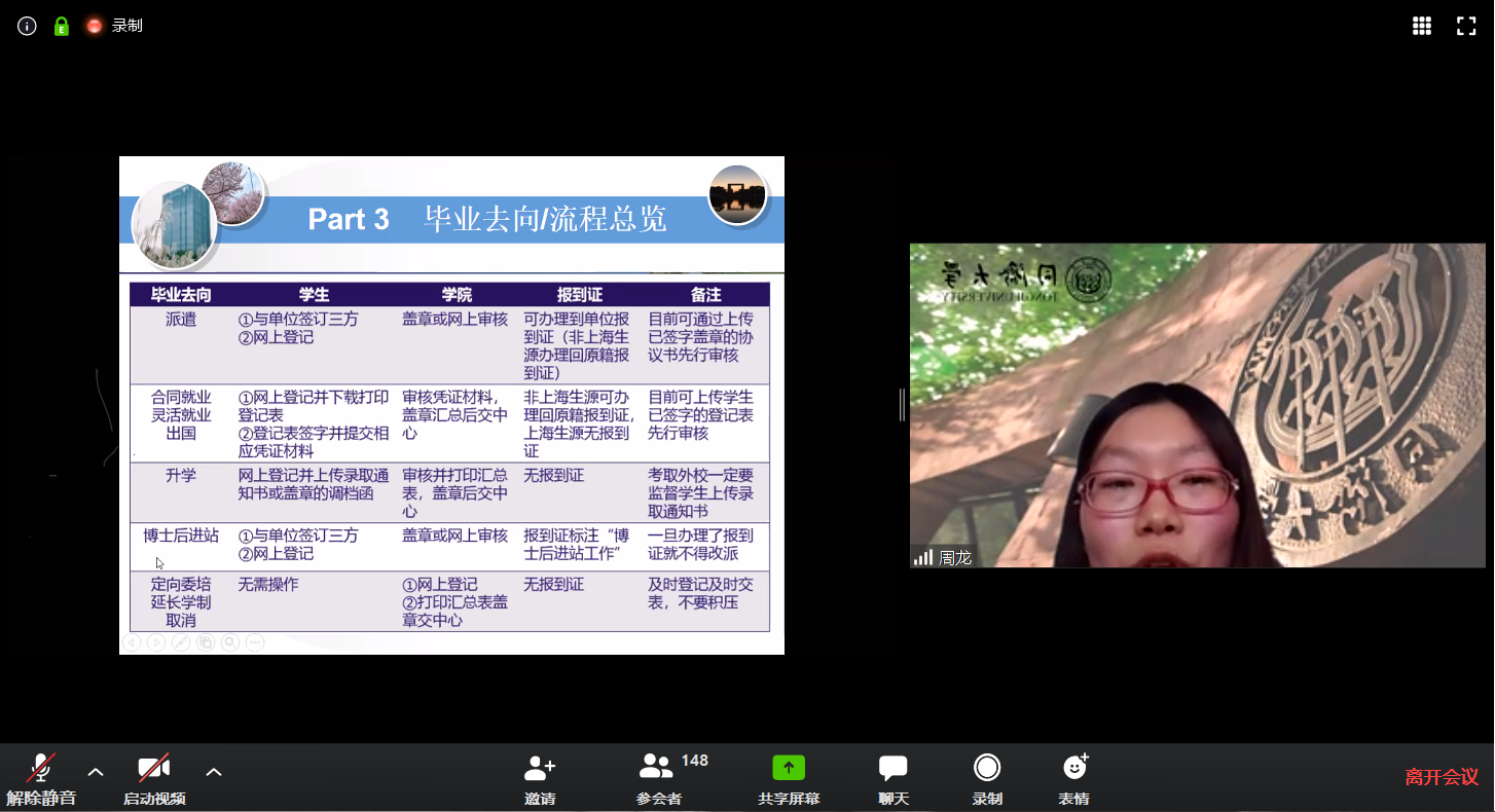 学院分管就业工作周龙老师为大家强调了毕业生去向的手续办理等事宜,涵盖生源信息、就业推荐表、毕业去向、报到证等版块。首先,周龙老师为大家详细阐述了生源地信息的定义以及核对的具体流程。其次,介绍了就业推荐表的制作,提醒大家有且只有一份原件,应妥善保管。另外,关于毕业去向登记(派遣、出国、升学、灵活就业等)注意事项,对于求职的毕业生而言,应先行签订三方以保障个人权益,希望同学们理性择业,诚信签约。最后分享了报到证的办理、离校相关手续和常用网站信息,提醒同学们要及时关注最新手续办理通知和进展情况,若有疑问可及时联系工作电话69584725。