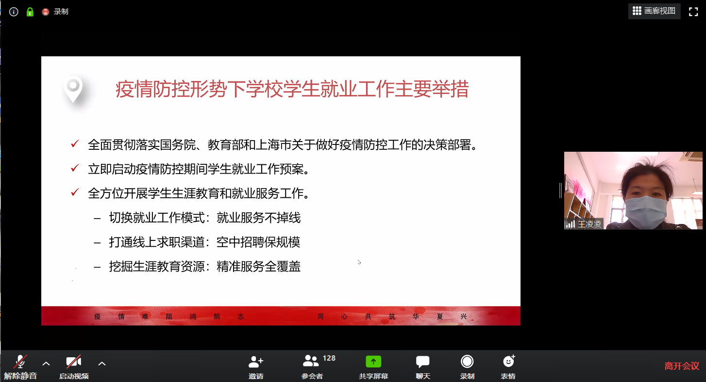 会议伊始,学院党委副书记王凌凌老师解读了疫情防控下的毕业生就业形势与政策。王老师从“统筹推进疫情防控期间学生就业工作”、“切换就业工作模式,就业服务不掉线”、“打通线上求职渠道:空中招聘保规模”、“挖掘生涯教育资源:精准服务全覆盖”、“2020年学校学生就业整体规划”和“各学院就业工作的具体要求”等几方面具体展开分享交流,为同学们答疑解惑。最后寄语同学们树立信心,教育部、学校至学院诸多层面都在积极为大家提供帮助和就业服务,鼓励同学们充分利用线上就业平台,密切关注平台信息动态,积极参与招聘宣讲等活动,与老师多加沟通交流,祝愿大家顺利就业。