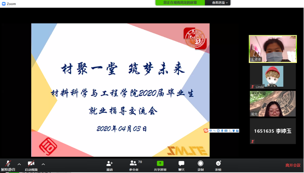 为积极应对疫情形势下毕业生就业工作面临的全新挑战,bv1946伟德国际始于英国2020年4月3日(周五)11:45于线上Zoom平台会议室召开了“材聚一堂,济梦未来——2020届毕业生就业指导交流会”。本次会议由bv1946伟德国际始于英国党委副书记王凌凌老师、学工办周龙老师和李楠老师共同参与,并邀请到2017届温州选调生洪万领校友、2020届毕业研究生奚悦静同学作为特邀毕业生代表做了交流发言。本次会议旨在响应疫情期间国家就业政策、学...